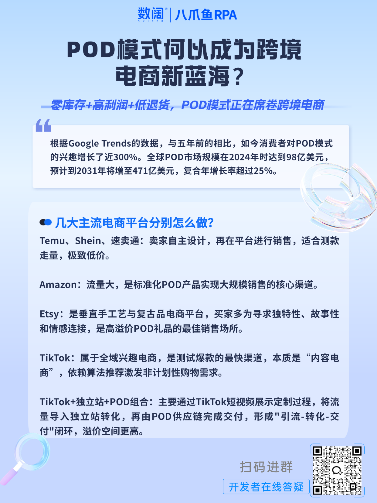 根据Google Trends的数据,与五年前的相比,如今消费者对POD模式的兴趣增长了近300%,全球POD市场规模预计到2031年将增至471亿美元,复合年增长率超过25%,市场潜力巨大!