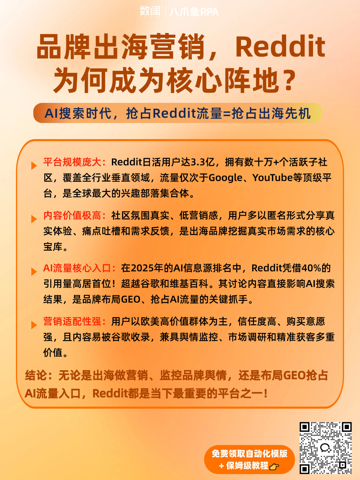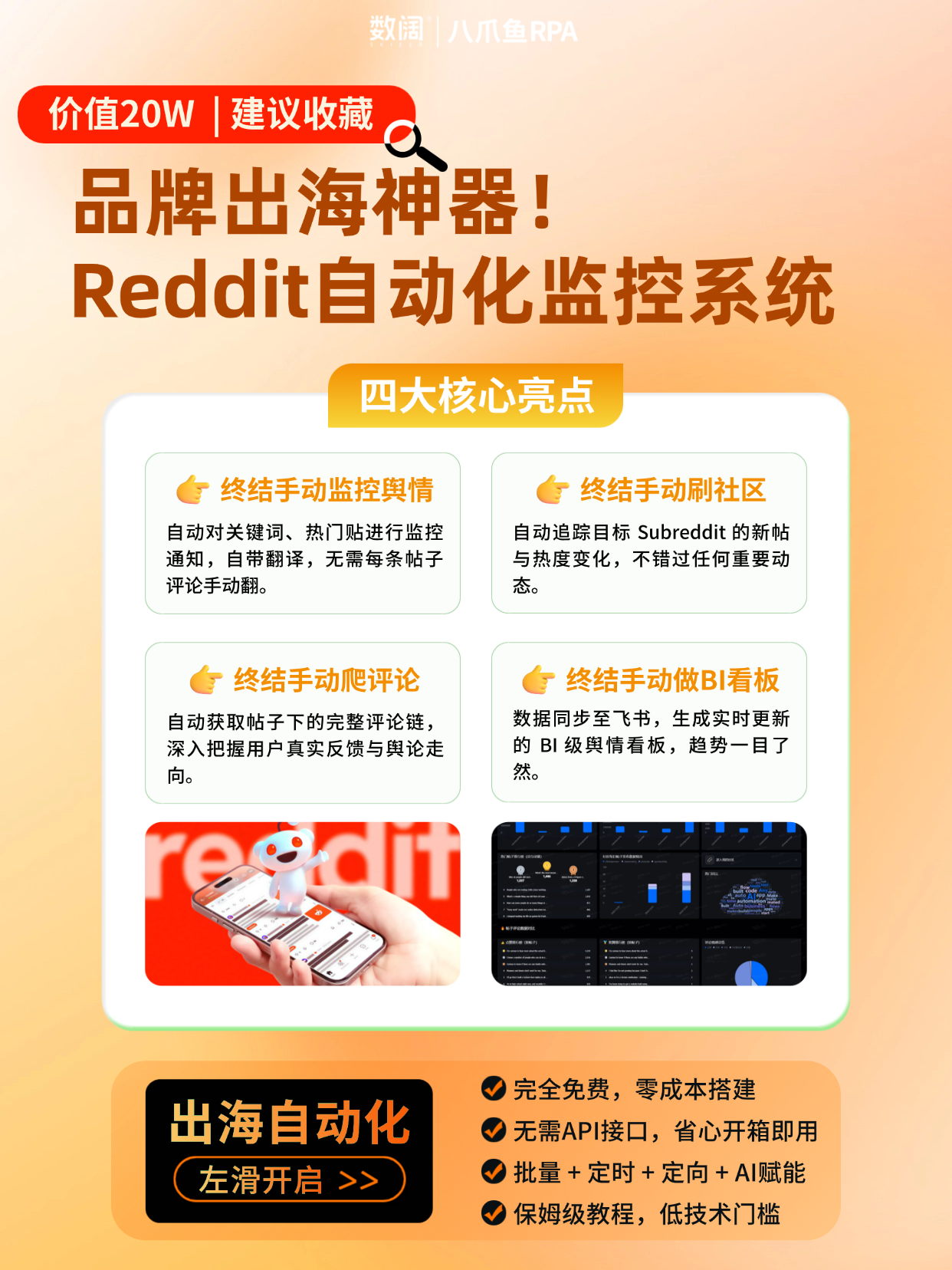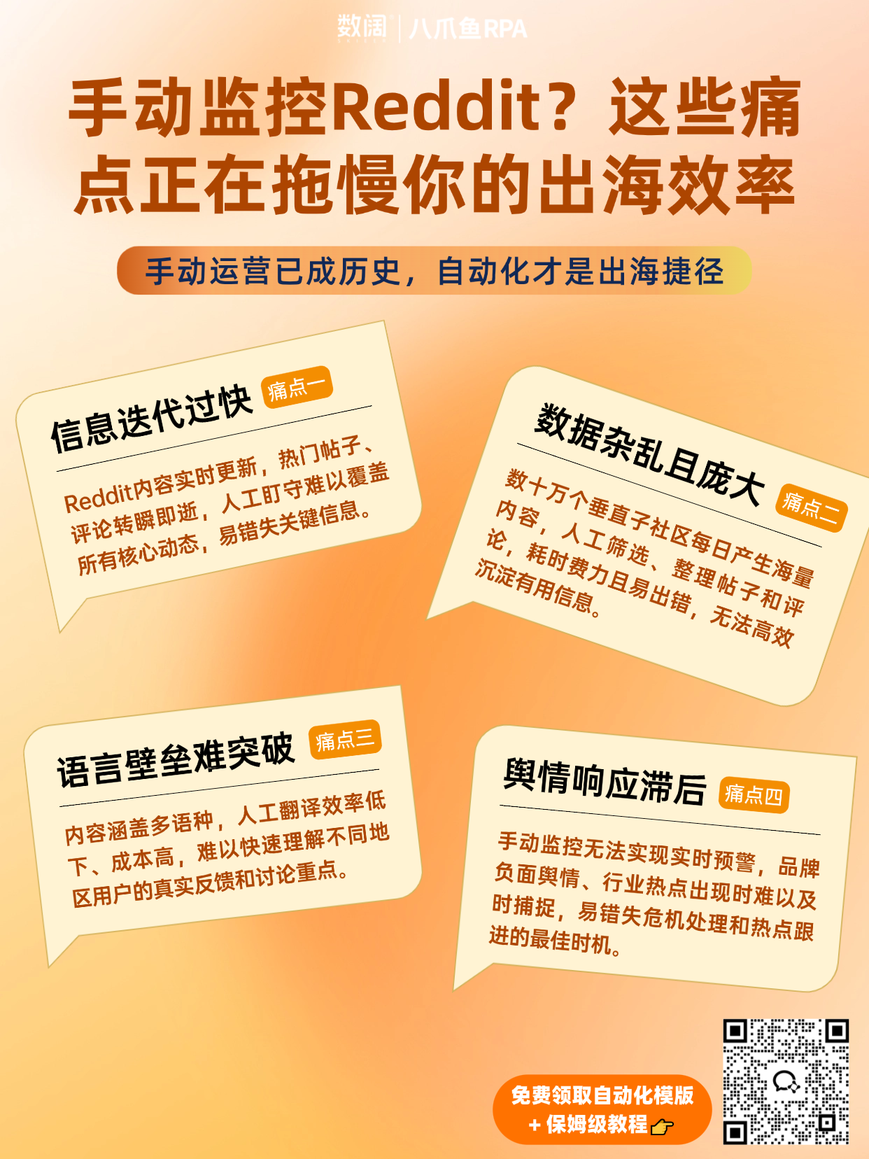 品牌出海抢占全球市场,Reddit早已成为不可忽视的核心阵地,可人工运营的低效问题,却让无数跨境团队错失流量与舆情先机。如今,八爪鱼RPA打造的Reddit全流程自动化模板,一站式解决所有难题,免费开放领取,帮你大幅提升出海营销效率。