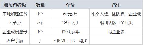 除了固定的套餐权益,此次升级小八还针对本地加速任务、云节点、企业成员账号等功能,推出叠加包服务。