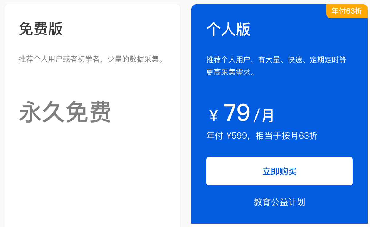 当然,如果是对任务量、采集速度等有进一步要求的个人用户,小八更推荐选择八爪鱼个人版。个人版不仅拥有免费版的所有功能,相较于之前的专业版,也做了更多的权益升级。