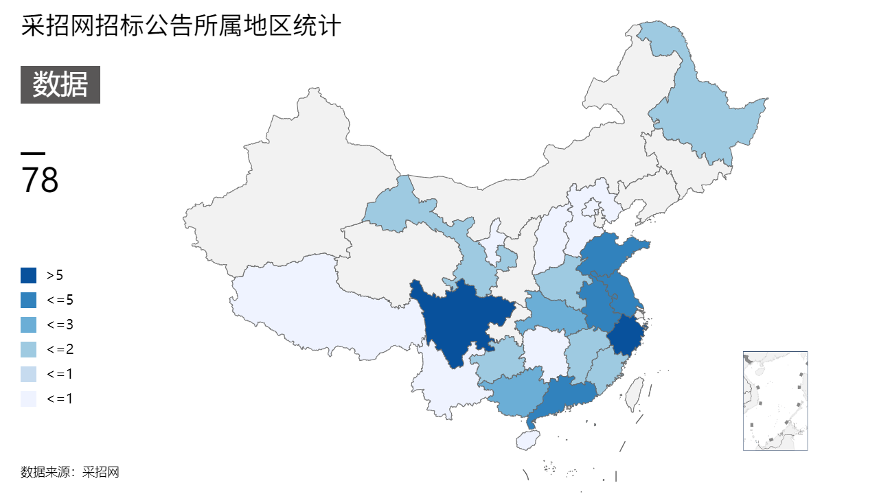 小八共统计了78个工程招标公告,整体看,华中和东南沿海地区的招投标公告远多于其他地区,其中浙江和四川分别以22和12份招标公告位列前列。