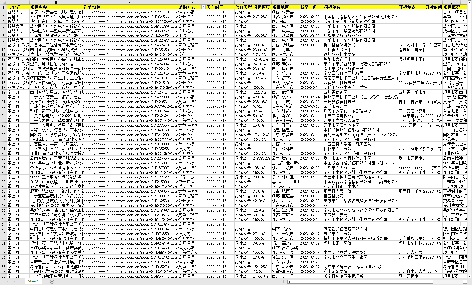 以小八采集的采招网工程招标采购信息为例,通过信息搜罗,企业可以直观了解到每个地区和部门的招投标项目情况、项目预算、采购方式等,从中挖掘出有价值的招投标交易信息,助力企业展开市场调查和竞品分析等。